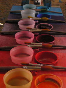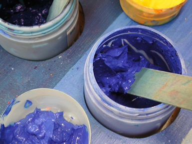 stellt Farben in allen wünschbaren Nuancen oder Mischungen zur Verfügung, in der Regel Gouache Künstler-Qualität (bei Bedarf sind auch Stifte, Ton, Kreide und andere Materialien der Kunsttherapie vorhanden).